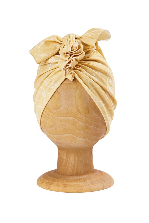 En söt turbanmössa i mjuk organisk bomull med en rosett och volanger under. Passar perfekt på stranden som skydd mot solen eller som alternativ till mössa under kyliga kvällspromenader.
